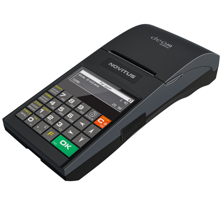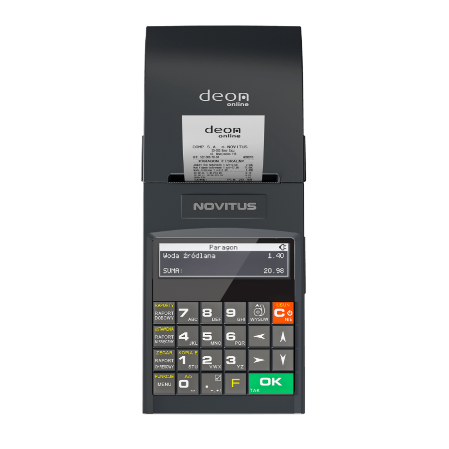 Jest to jedna z najbardziej ergonomicznych drukarek fiskalnych w ofercie NOVITUS, która jednocześnie obsługuje komunikację z Centralnym Repozytorium Kas (CRK), zgodnie z wymogami Rozporządzenia Ministra Przedsiębiorczości i Technologii z dnia 28 maja 2018 r. w sprawie kryteriów i warunków technicznych, którym muszą odpowiadać urządzenia fiskalne rejestrujące. Kopia wydruku dla użytkownika przechowywana jest w pamięci chronionej urządzenia, a dostęp do niej jest realizowany poprzez dedykowaną aplikację. Jak każda drukarka fiskalna marki Novitus, również Deon Online ma możliwość drukowania faktur VAT na swoim mechanizmie drukującym. Drukarki online na formatce faktury oprócz danych Nabywcy mogą również drukować dane Odbiorcy faktury VAT. Mogą też drukować dowolne wydruki niefiskalne, zawierające tekst, grafikę oraz kody kreskowe i QR.