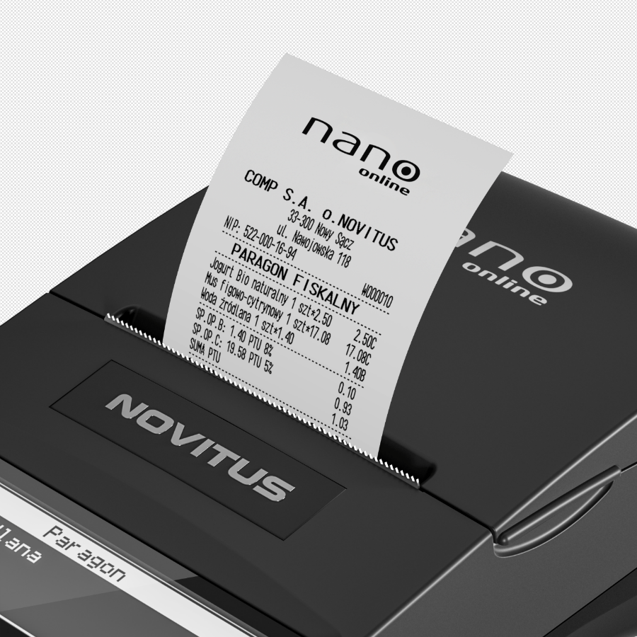 NANO online to wszechstronna kasa, dedykowana zarówno do pracy stacjonarnej jak i w terenie, w usługach oraz średnich i małych placówkach handlowych. Zaufaj marce, używanej przez ponad 900 000 użytkowników. Jest to najmniejsza kasa fiskalna w ofercie NOVITUS, która jednocześnie obsługuje komunikację z Centralnym Repozytorium Kas (CRK), zgodnie z wymogami Rozporządzenia Ministra Przedsiębiorczości i Technologii z dnia 28 maja 2018 r. w sprawie kryteriów i warunków technicznych, którym muszą odpowiadać kasy rejestrujące. Kopia wydruku dla użytkownika przechowywana jest w pamięci chronionej urządzenia, a dostęp do niej jest realizowany poprzez dedykowaną aplikację.